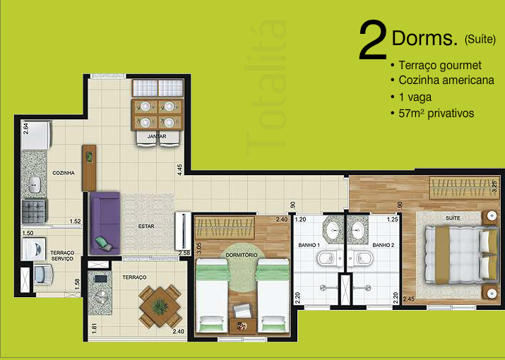 Apartamentos com 57, 61 e 68 m² de área privativa